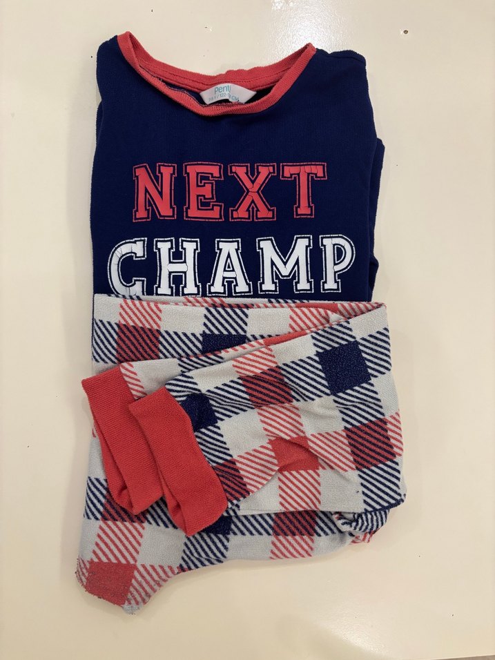 Uzun kollu, bisiklet yaka ve baskılı 'NEXT CHAMP' yazılı, kırmızı ve koyu renklerde örme kumaştan erkek çocuk pijama takımı. Pantolon kareli desenli ve kırmızı manşetlidir.