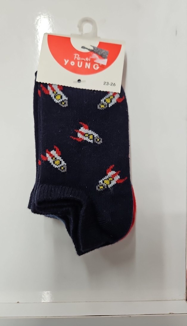 Penti erkek çocuk çorabı, koyu zemin üzerinde renkli roket desenine sahip, 23-26 numara. Rahat ve eğlenceli tasarım. 4'lü settir