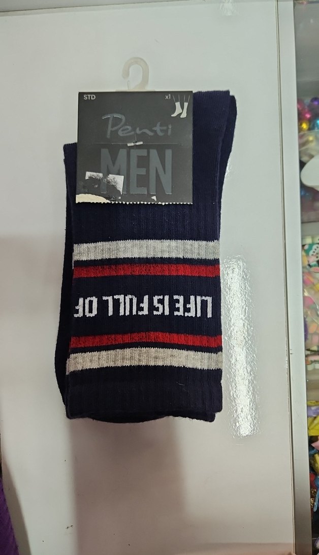 Penti markalı, baskılı desenli, mavi, gri ve kırmızı renklerde, kısa ve dar kesim erkek spor çorabı.