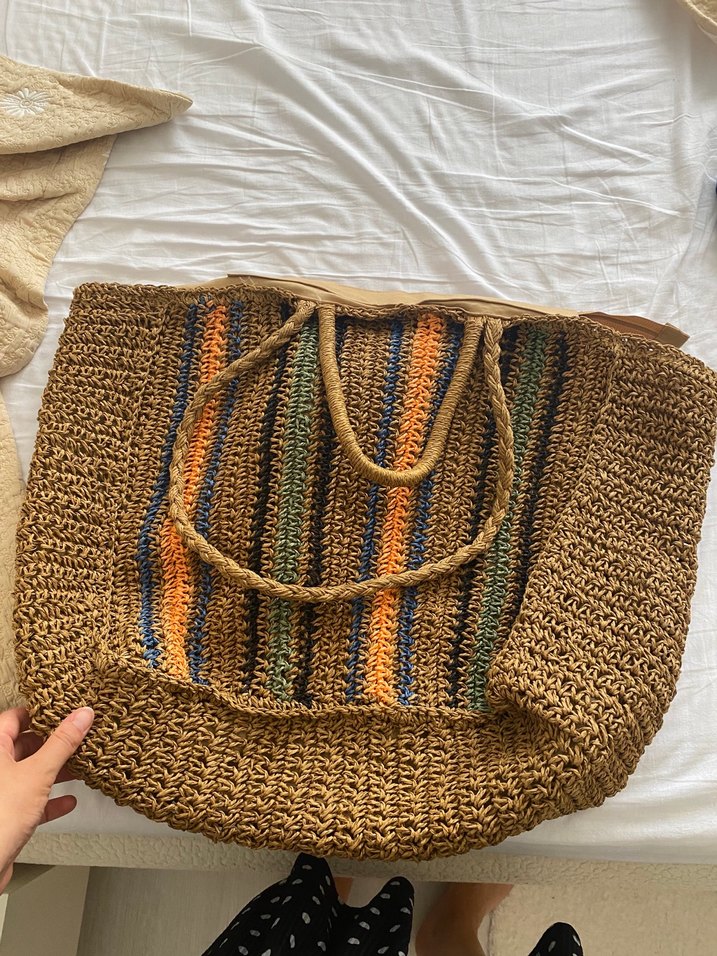 Örgü çok renkli, bohem tarzda kadın çantası, örgülü saplarla günlük kullanıma uygundur.