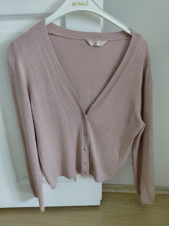 Penti s beden pembe simli hirka, rengi daha koyu ama fotolarda çok açık çıktı, en fazla 2 kez giyildi, temiz sorunsuz