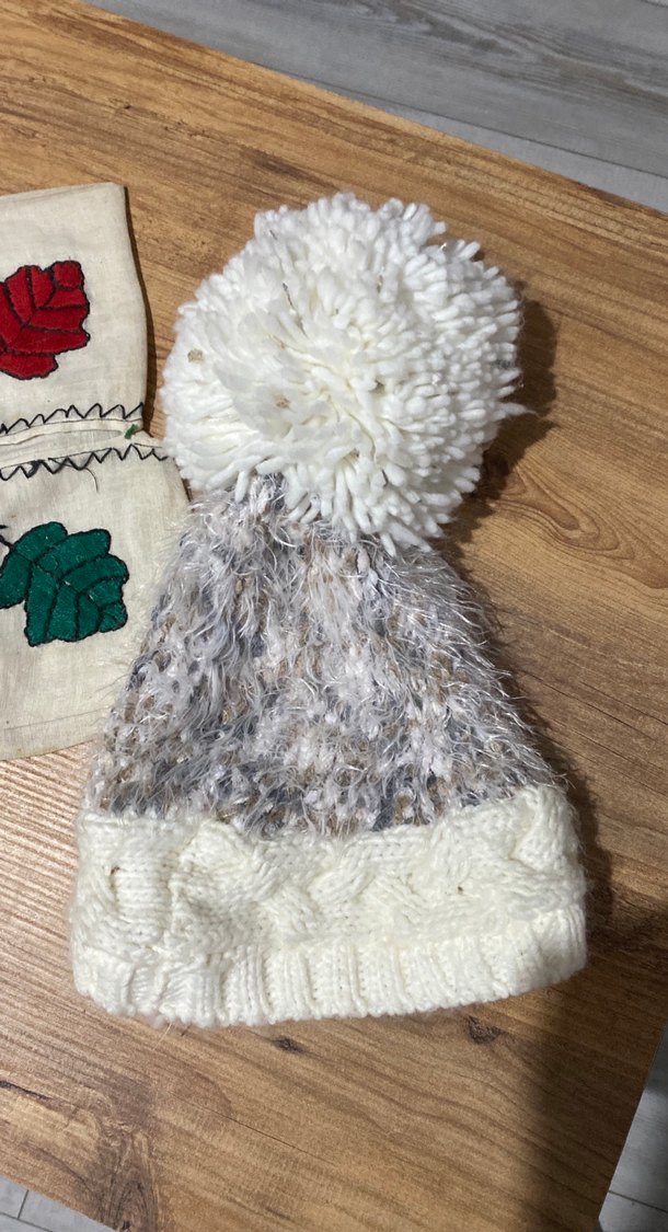 Kadınlar için büyük beyaz ponponlu, beyaz ve gri örgü desenli bohem tarzda örgü bere. ❄️