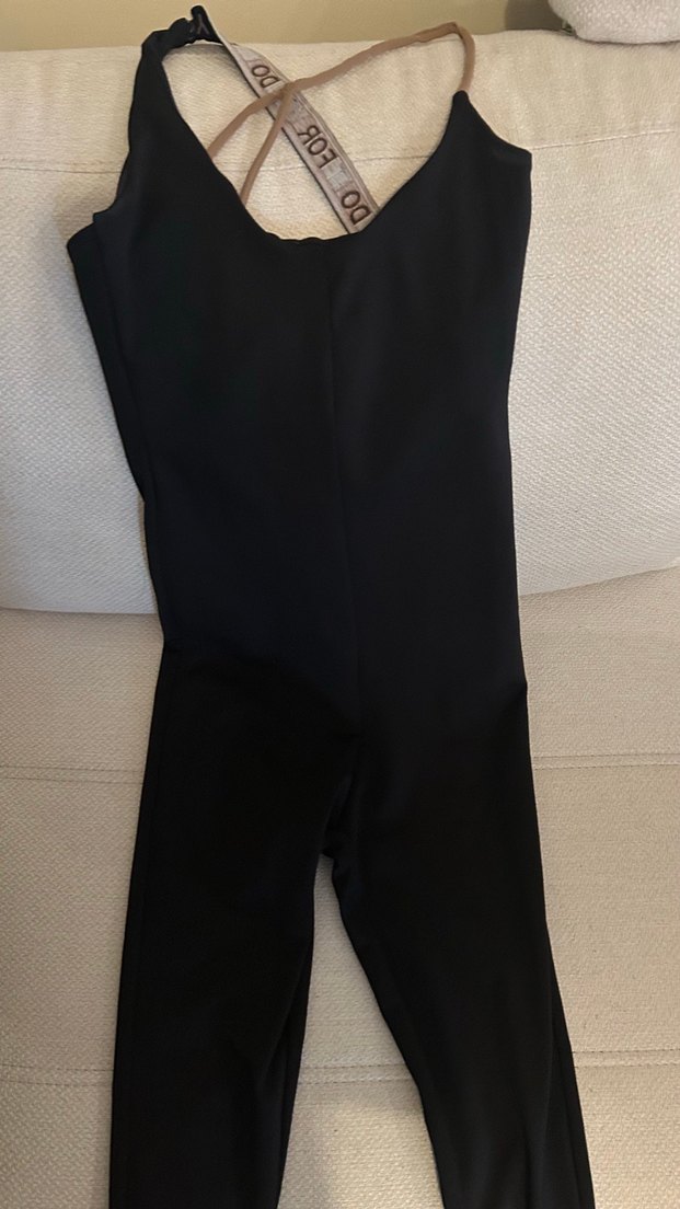 Siyah, dar kesim, askılı kollu ve yakası kesik detaylı tayt tulum. Sentetik kumaştan, spor için uygun, şık ve sokak stilini yansıtan athleisure tarzı spor tulum.