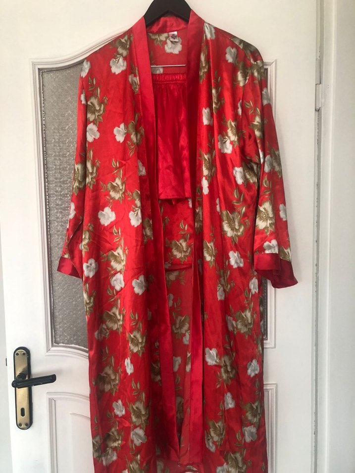 Uzun, bol kesim kadın sabahlık, koyu kırmızı çiçek desenli ve uzun kolludur, vintage tarzını yansıtır. 3 parçadan oluşuyor şortu askılı sabahlı marka temsilidir
