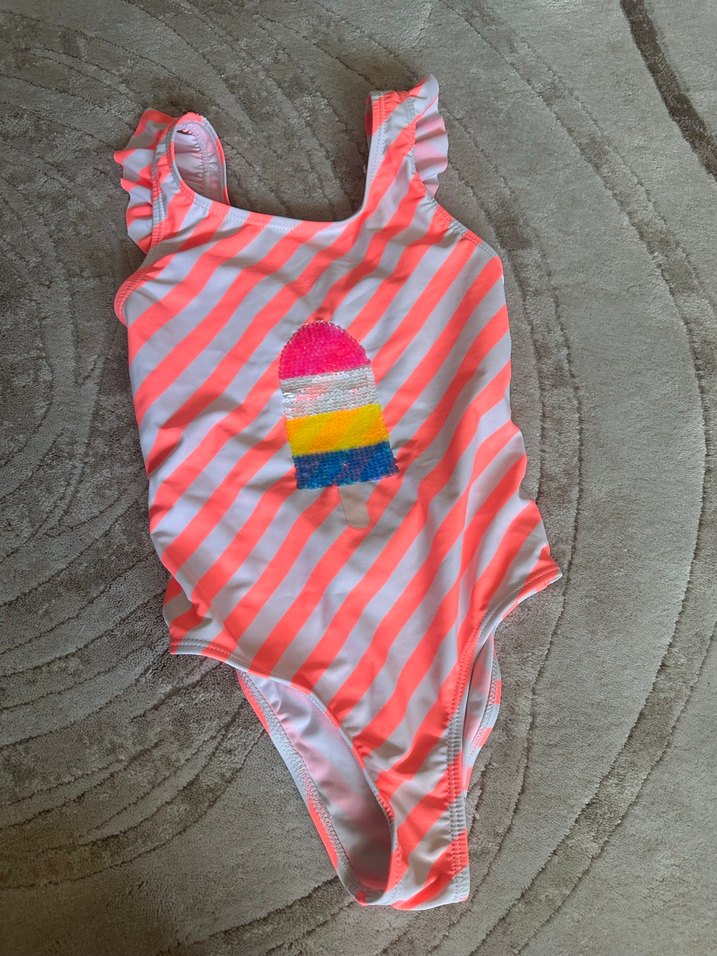 Marka temsilidir.yurt dışından alınmıştır.Çizgili ve fırfırlı askılı, renkli kız çocuk mayo. Önünde eğlenceli dondurma deseni bulunur.