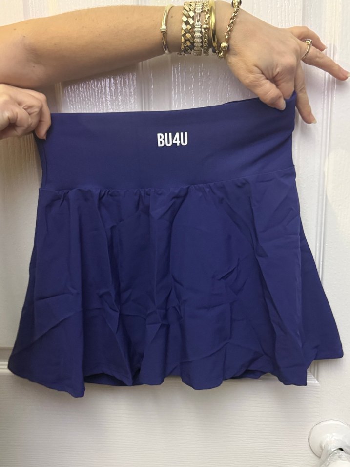 Parlak mavi renkte, spor altı şortlu etek vücuda oturan etek.Spor ve sokak modasına uygun.