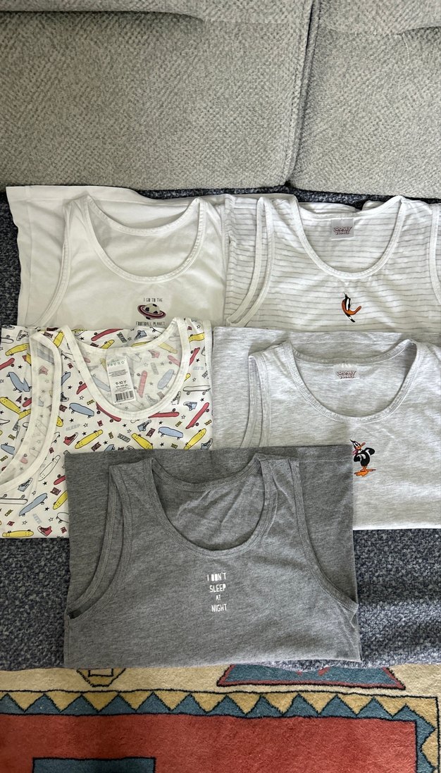 Gri, beyaz ve desenli tasarımlardan oluşan 5'li çocuk atlet paketi, yumuşak kumaştan üretilmiştir.