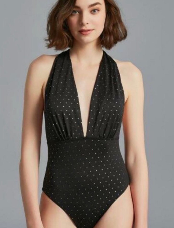 Penti marka kadın mayo. 38 beden. Siyah zemin üzerine altın rengi puantiye desenli, oldukça şık bir model. V yaka, derin göğüs ve sırt dekoltesiyle zarif ve feminen bir duruş sunar. Hiç giyilmedi. Kargo onaylanınca özenle paketlenip gönderilecektir. ✨ #Penti #PentiMayo #KadınMayo #SiyahMayo #AltınDetay #VYaka #DekolteliMayo #Beachwear #Resortwear #Yazlık #PlajStili #Kadıngiyim
