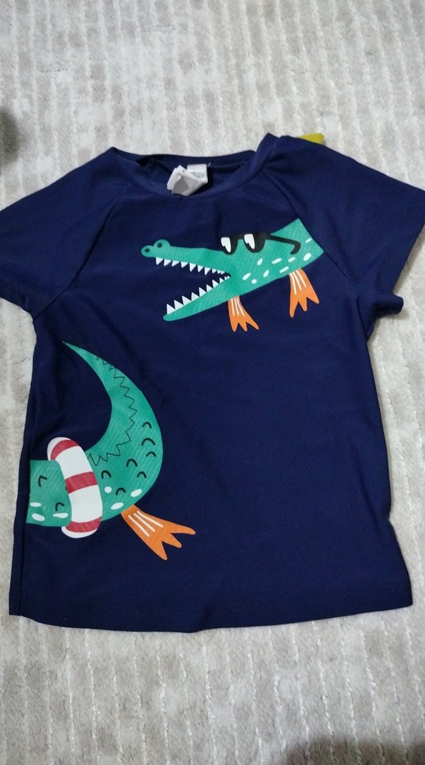 Mavi zemin üzerine renkli baskılı timsah figürlü, rahat kumaştan erkek çocuk kısa kollu tişört.