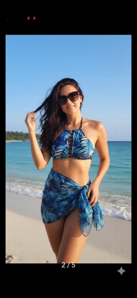 Mavi, bağlamalı askılı ve fermuarlı ön detaylı, bohem bağlama desenli sıkı oturan bikini üstü. Plaj için retro tarzda.vitrin görseli temsilidir