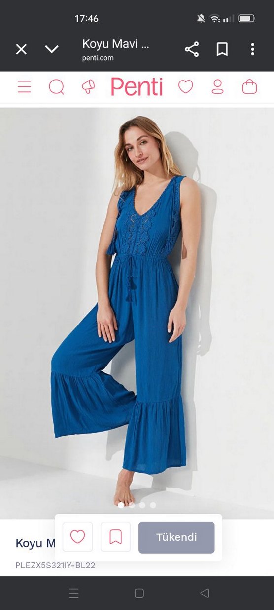 Mavi renkte, straplez yakalı ve fırfırlı detaylı, uzun ve salaş kesim kadın tulumu. Yumuşak sentetik kumaştan, bohem tarzda, kolsuz ve günlük kullanıma uygun. M beden. ✅ Sıfır ürün. Flaş indirim.