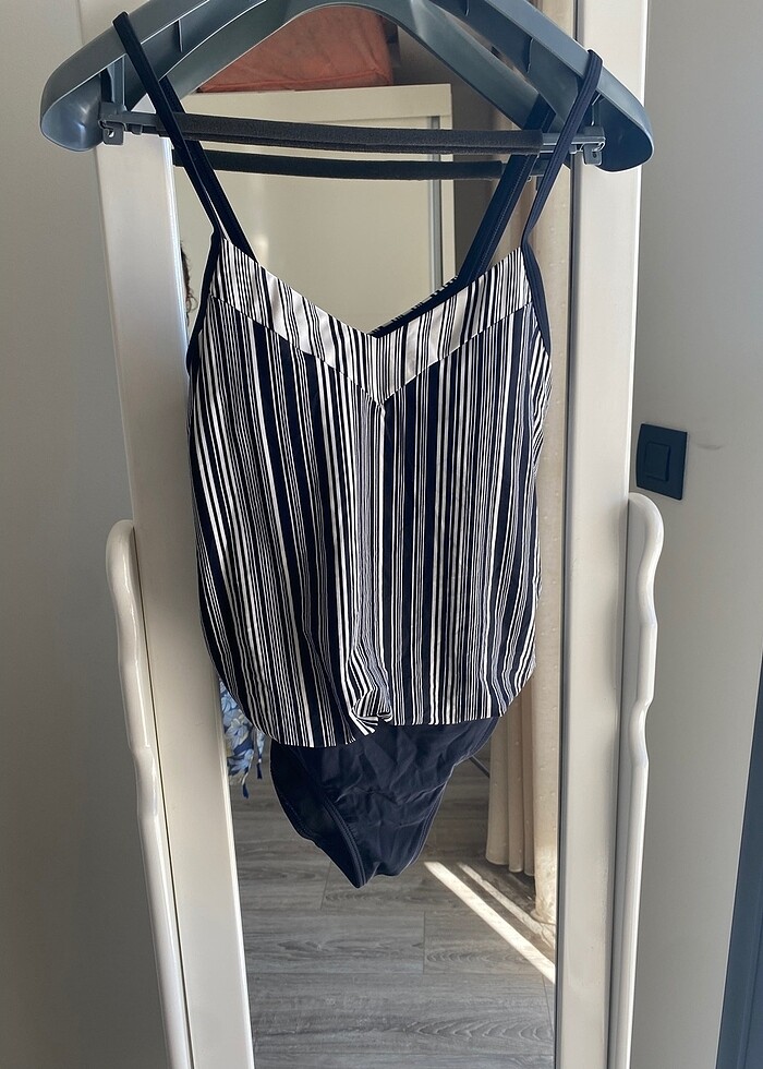Penti mayo. Hediye geldi, denerken, küçük geldiği için1-2 dikişi patlamış. Belli olmuyor. Son ftg.da görebilirsiniz. Hiç kullanılmadı. Üst kısmı dökümlü , göbeği belli etmiyor.