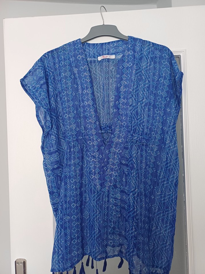 V yakalı, dökümlü ve bol kesimdir. Kolsuz, midi boy ve tül kumaştan üretilmiştir.