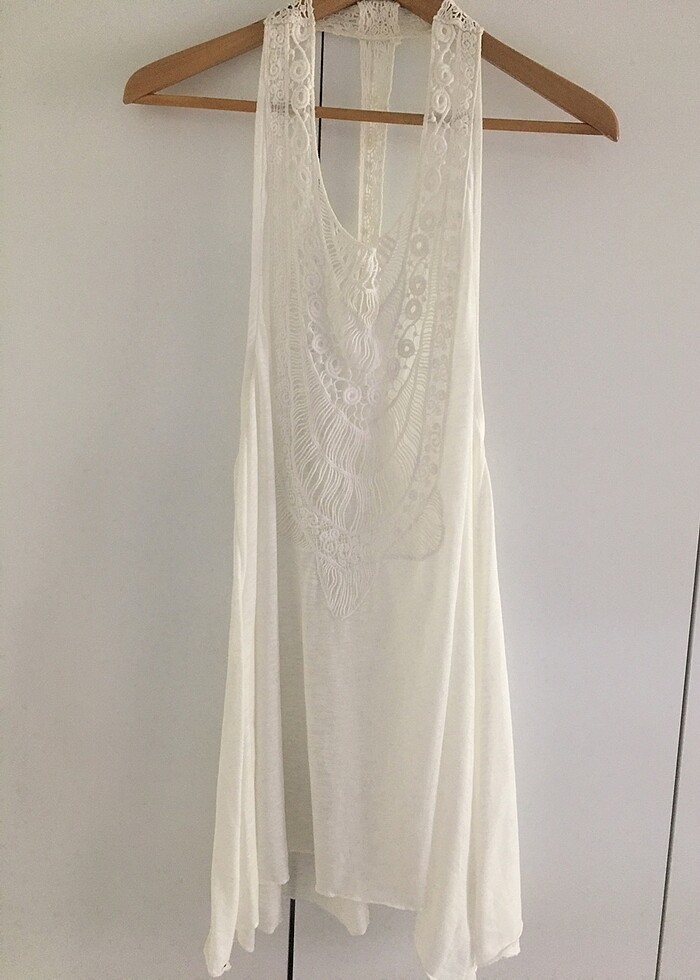 Temiz sorunsuz. Kemik rengi, dantelli, halter yaka kısa elbise. Göğüs 51 boy 82 cm.