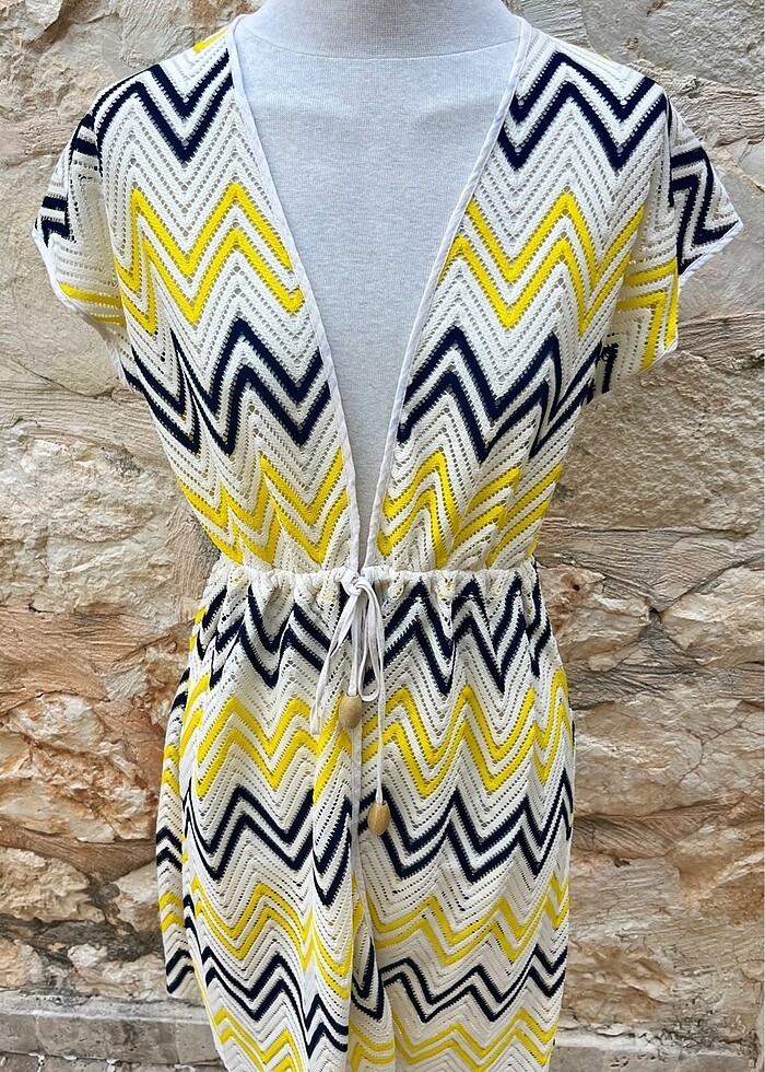 Kadın plaj elbisesi, pareo. Yeni ve hiç kullanılmamıştır. Pentiden alınmıştır. Sarı, ekru ve lacivert renklerden oluşmaktadır. Belden bağlamalı, standart beden.
