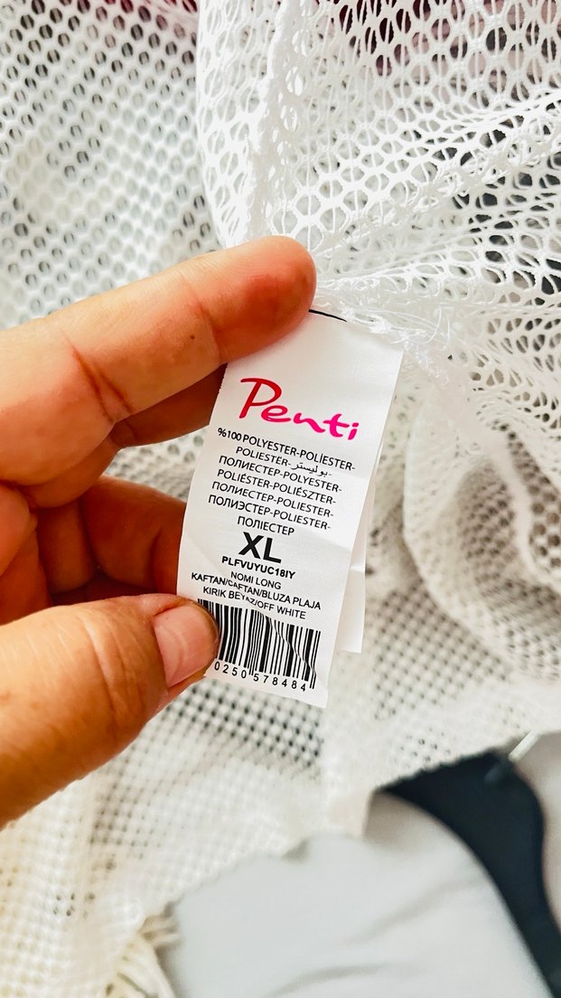 Pareo Penti XL beden, %100 polyester malzemeden üretilmiş beyaz fileli tül kumaşa sahiptir, hafif ve nefes alabilir dokudadır. Hiç kullanılmadı 38 40 42 bedene kadar uygun uzun önden düğmeli şık bir pareo krem renk iade yoktur