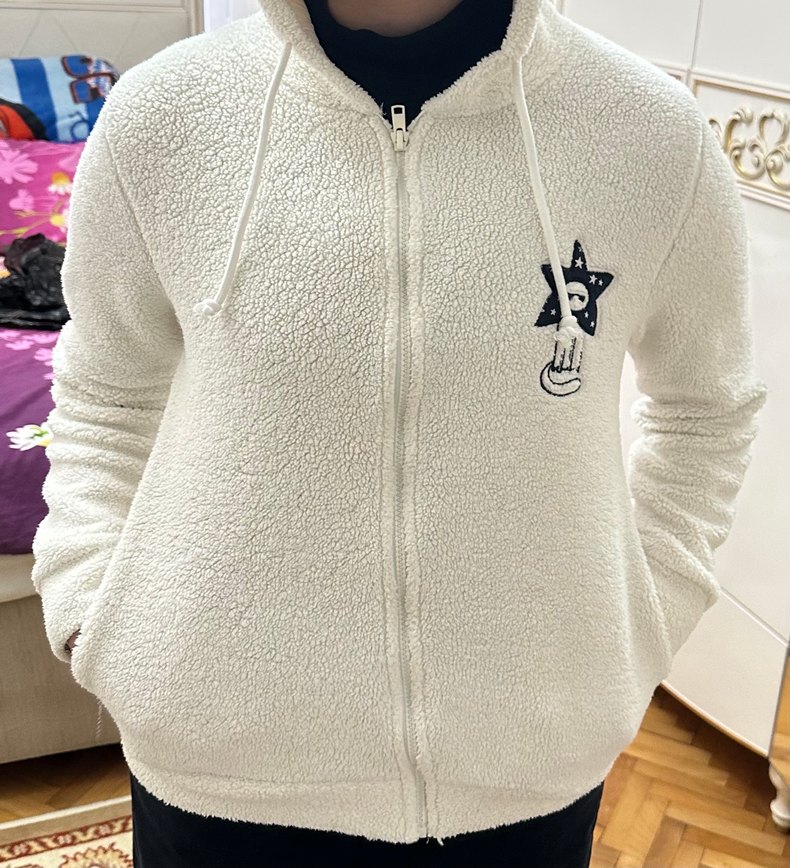 Fermuarlı, nakışlı yıldız detaylı, parlak beyaz yumuşak kumaştan, dar kesim kadın ceket. Trendy günlük sokak stili için uygundur. ✨