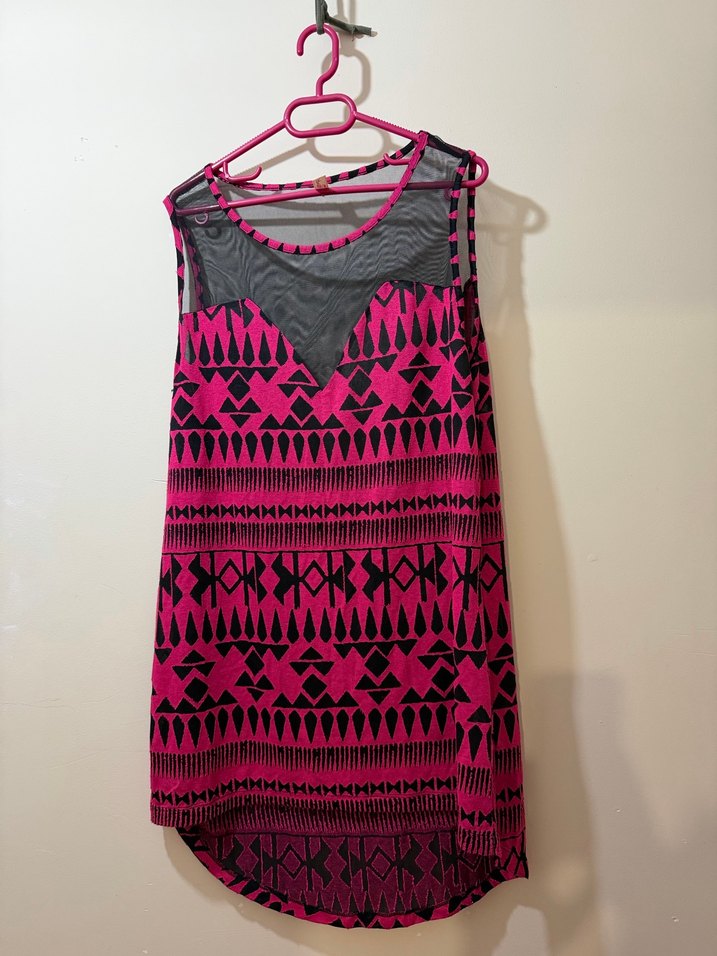 Pembe renkli geometrik desenli, kolsuz pareo. Penti bi kaç kere giyildi temiz