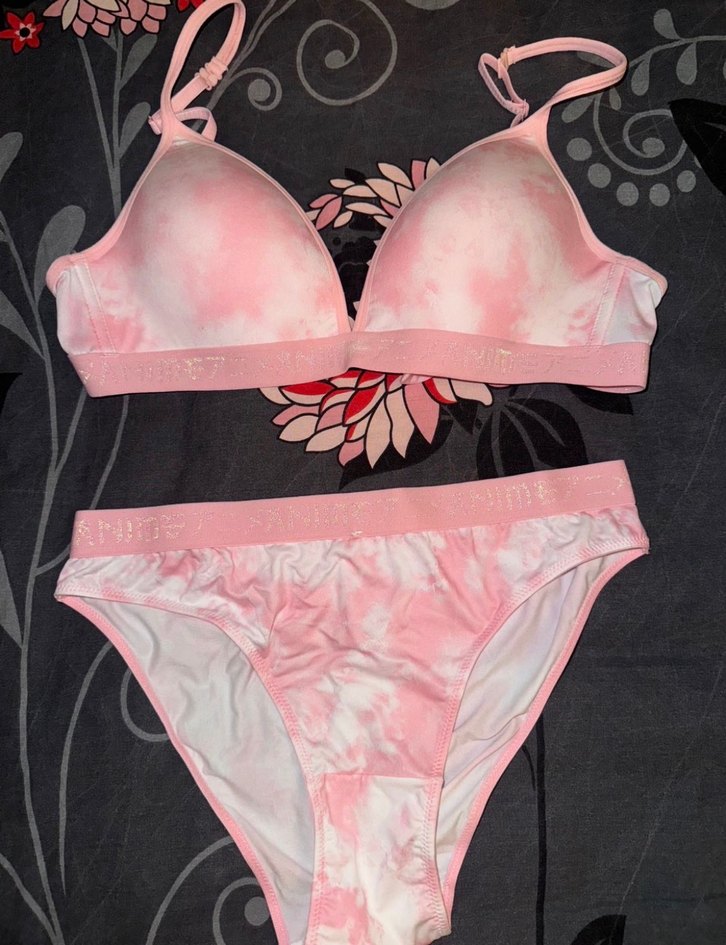 Ayarlanabilir askılı, pembe pastel tie-dye desenli atletik sütyen ve külot seti, rahat sokak giyimi için tasarlanmıştır. Hiç giyilmedi 75b cup takım