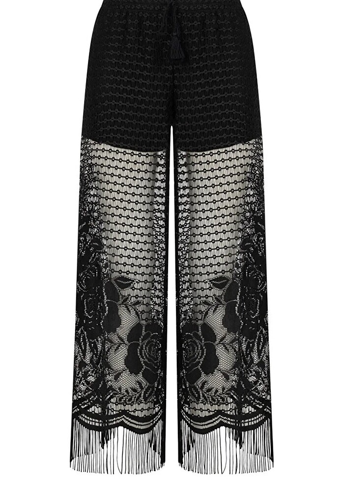 Etiketi üzerindedir. Lace Pantolon'la plajın en iddialısı olmaya hazır mısın? Lace Pantolon, kalçanın hemen altında biten opak şortu sararak bileklerine doğru dökülen şık dantel tasarımıyla bu yaz tüm bakışları üzerinde toplayacak. Üst kısmı kuş gözü ve ağ desenlerinden oluşan Lace Pantolon'un diz kapaklarından bileklerine uzanan iri floral motifleri, tenini doğanın tazeliğiyle süsler. Lace Pantolon'un geniş su dalgası motifleriyle biten İspanyol paçalarından topuklarına dökülen püsküller, yumuşacık dokunuşlarla tenini okşar.