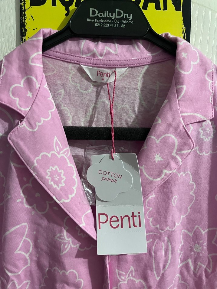 Penti marka, pamuklu, kısa kollu, bol kesim, pudra pembe baskılı pijama takımı. Midi boy ve rahat kesimiyle konfor sağlar.