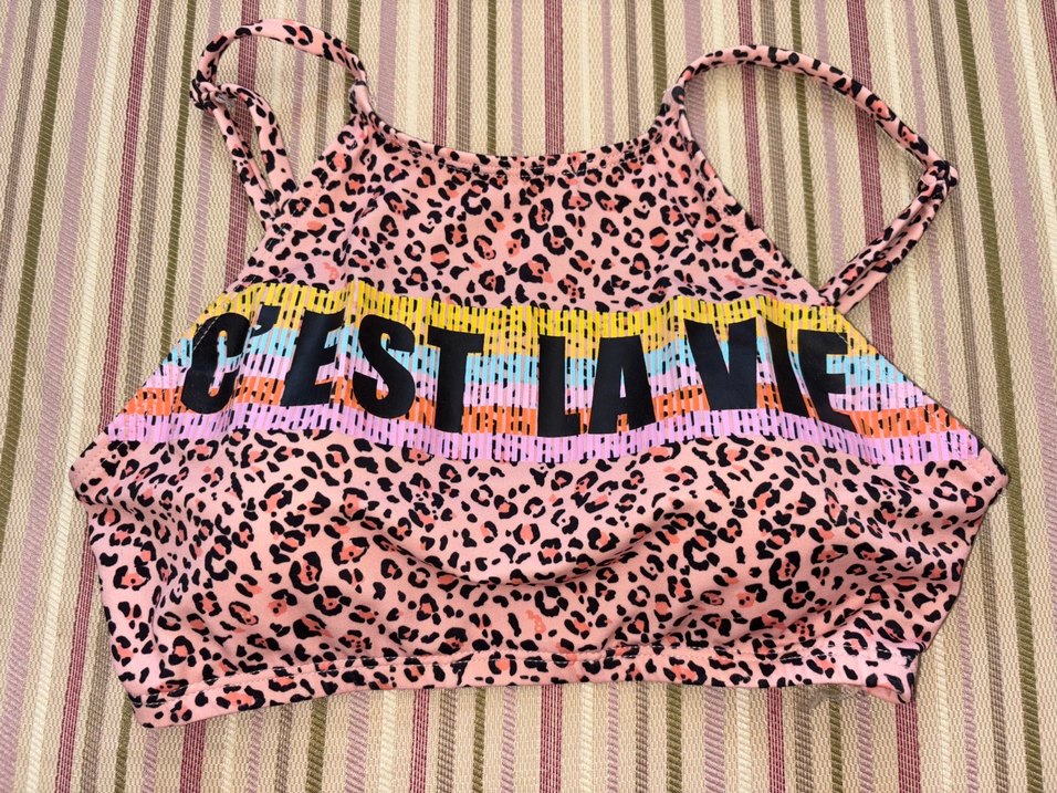 Renkli leopar desenli, ince askılı kız bikini üstü, önünde büyük yazı detaylarıyla. #yaz #giyim #bikini #top #crop