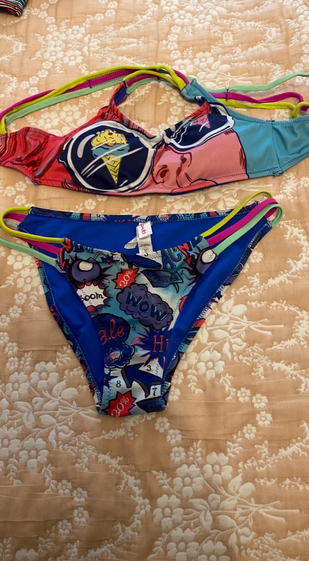 Renkli, pop art desenli, kısa kesim ve elastik detaylı bikini. Bohem ve retro tarzıyla plajda dikkat çeker. Az giyildi