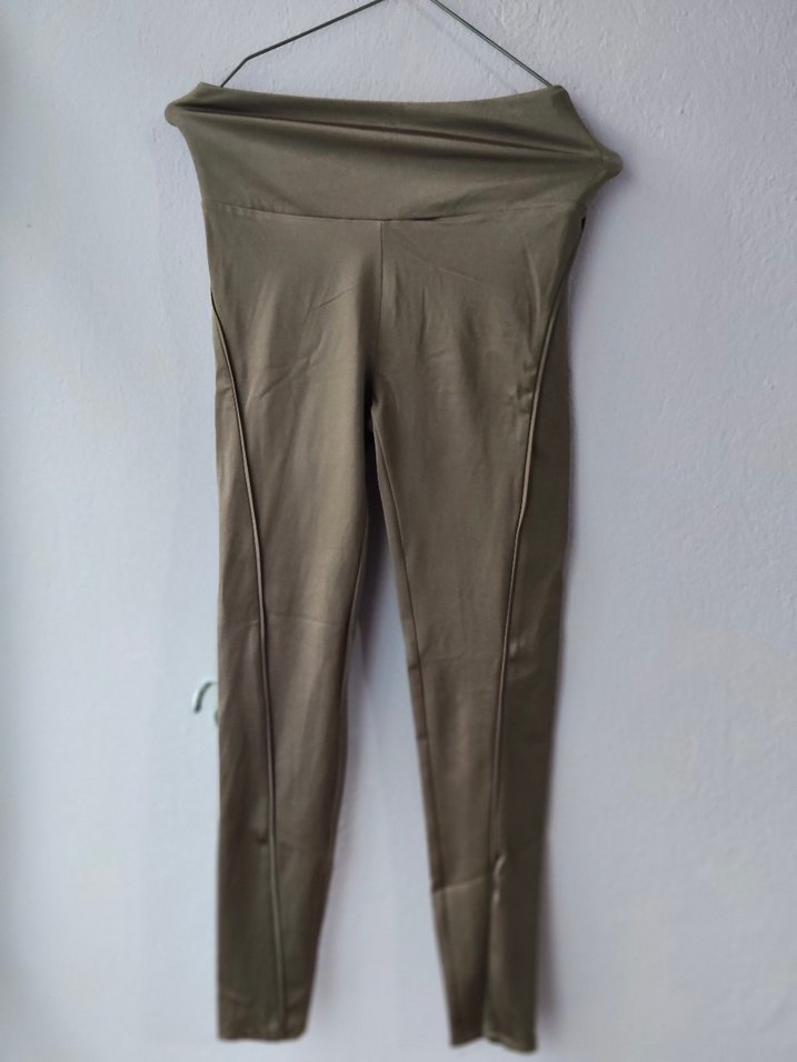 Beli kuşaklı, bej renkli, sentetik kumaştan yapılmış kadın taytı. Midi boyda, gündelik kullanıma uygun, rahat ve şık.