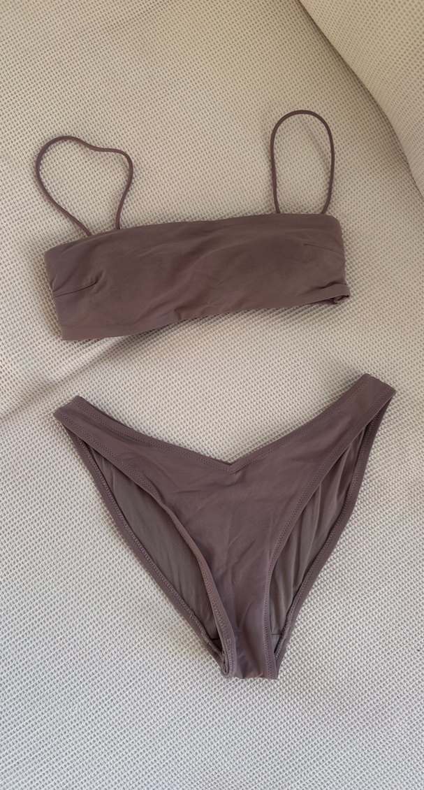 İnce askılı ve vücuda oturan kahverengi bikini, sade ve minimal bir görünüme sahiptir. Düz ve yumuşak kumaşıyla plajda rahat kullanım sağlar. Defosu kusuru yoktur.