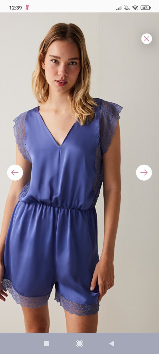 Kadınlar için parlak mavi kumaştan, kısa kollu ve bol kesim tulum. Kollarında dantel detayları bulunur, kısa boyu rahatlık sağlar. ✨Yeni etiketli.