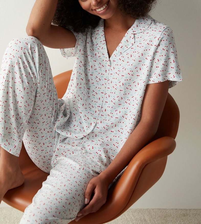 Kadın pijama takımı kısa kollu ve bol kesimlidir. Gri beyaz batik desenli,rahat ve çağdaş bir tarz sunar.