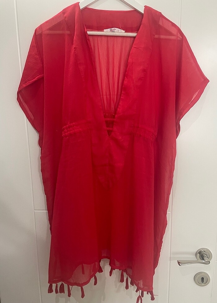 Penti şifon plaj giysisi.. Temiz kullanılmıştır.. Ön ve arkada lastik büzgü vardır..L beden Ölçüleri : Göğüs yarıda 62 cm, Boy 80 cm