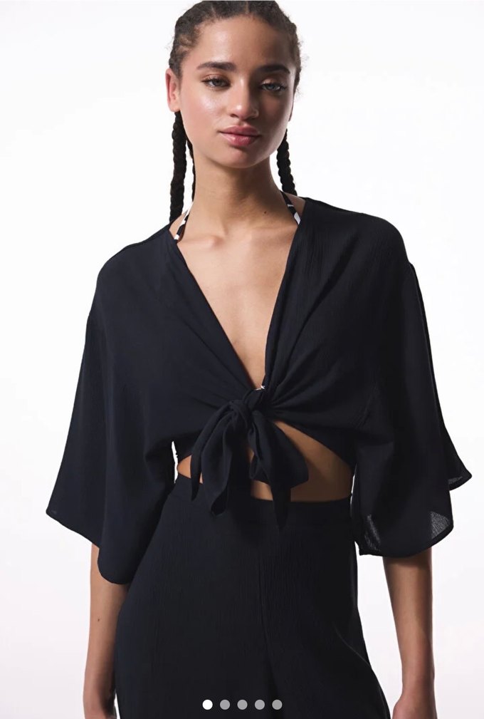 Siyah renkli, V yakalı ve drapeli tasarıma sahip kadın bluz. Salaş kesim, kısa boy ve askılı kollu, ön bağcıklı detayda. Yumuşak kumaştan, cesur sokak tarzı için uygun.