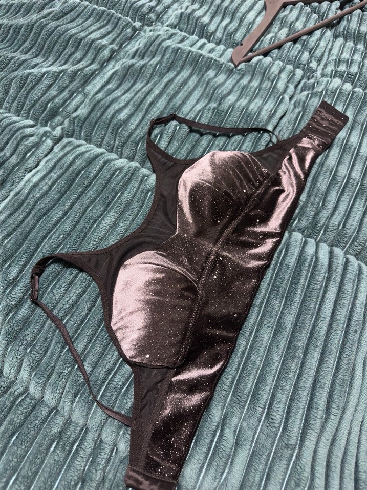 Siyah renkli, parlak ve düzgün dokulu gotik tarzda sütyen. İnce askılı ve normal boy uzunluğunda.