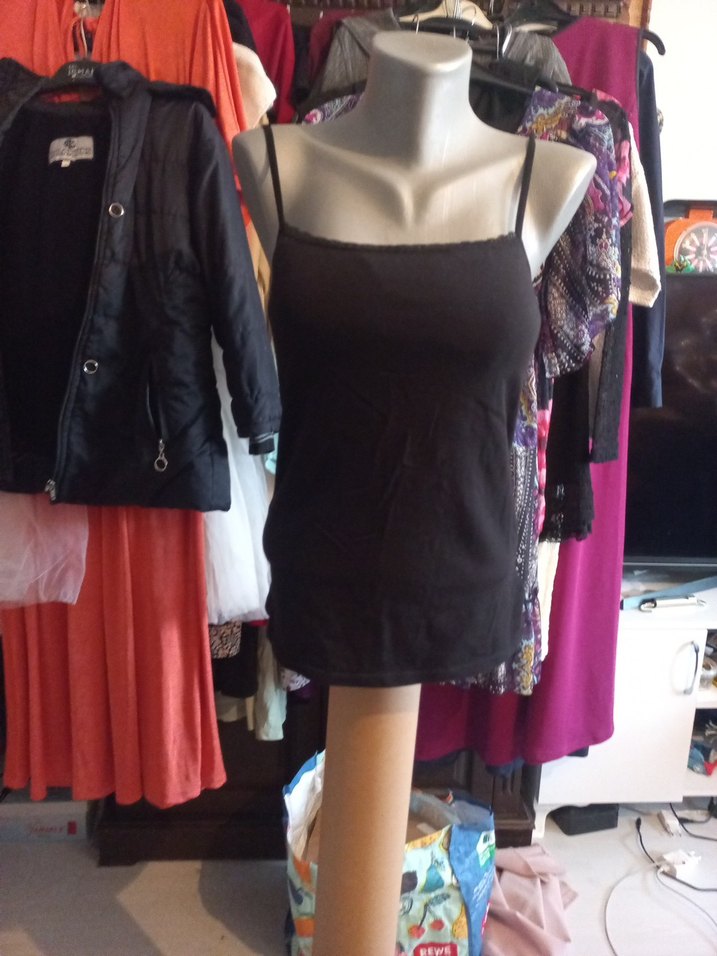 Siyah, ince askılı ve straplez yaka, vücuda oturan kadın atlet. Pürüzsüz sentetik kumaştan, günlük rahat kullanım için uygun. desteklidir
