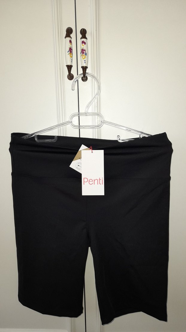 Penti markalı, siyah, baskılı, sentetik kumaştan yapılmış, cırt cırtlı, normal boy biker spor taytı. Spor ve sokak stiline uygundur.