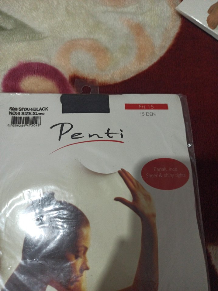 Parlak baskılı desene sahip, siyah ve plastik malzemeden yapılmış, vücuda oturan midi uzunluğunda külotlu çorap. Penti markalı, 15 DEN.