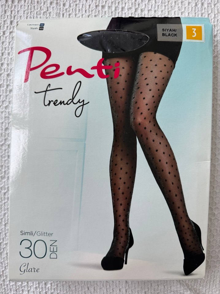 Penti markalı, siyah puantiyeli ve simli detaylı, 30 DEN kalınlığında sentetik kumaştan yapılmış çocuk külotlu çorap. ✨
