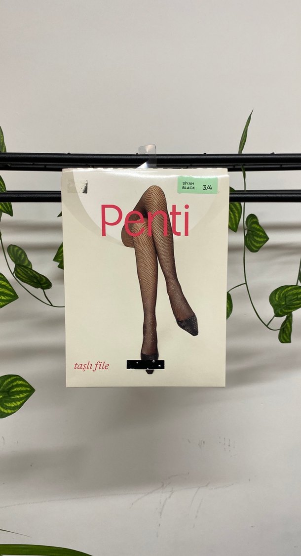 Penti markalı, siyah renkli, baskılı file çorap. Plastik malzemeden üretilmiş, mini boy ve vücuda oturan kesime sahip.