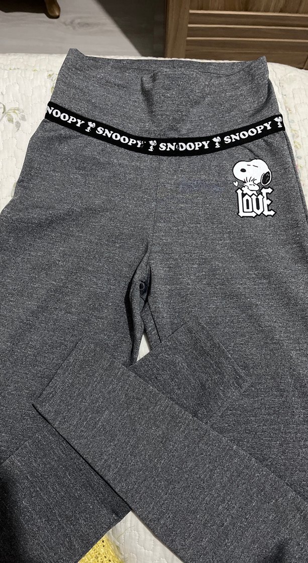 Gri renk Snoopy baskılı, rahat bel bantlı, spor ve günlük kullanıma uygun çok rahat tayt Xs bedendir Not: Yazı kısmınının içinden ip geçiyor kordon tarzı maalesef ipi yok kayıp onun için minik bi indirim yapılacaktır.