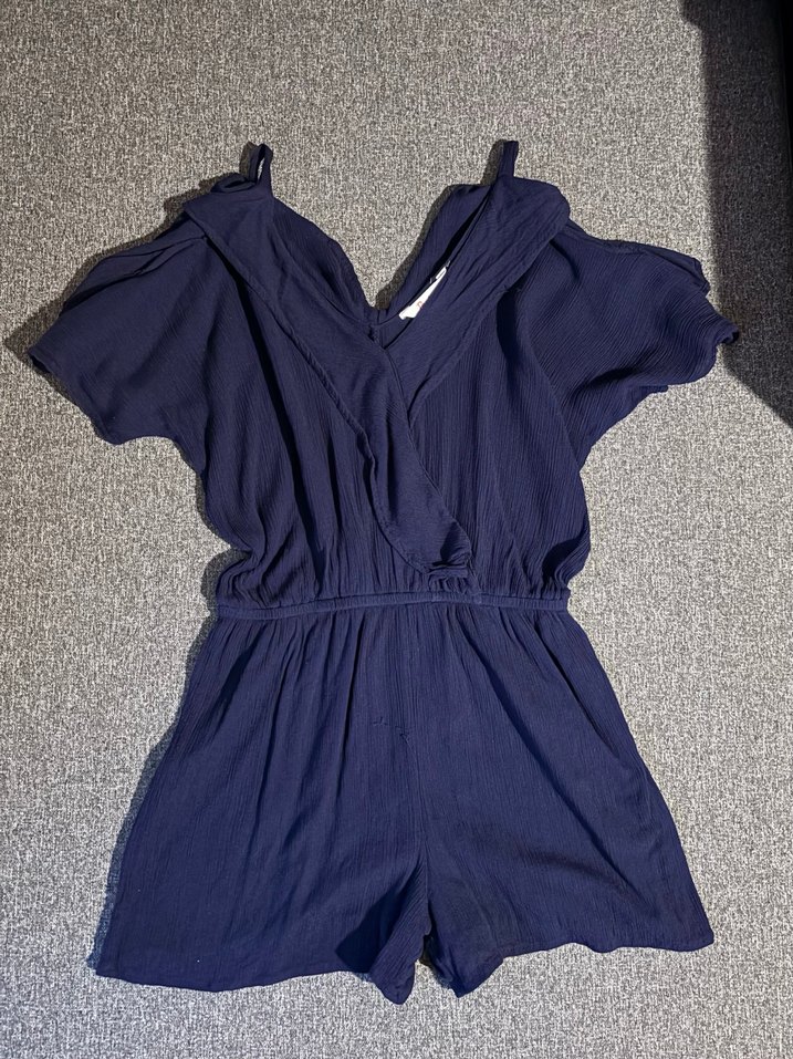 Lacivert keten kısa tulum, bol kesim, V yaka ve omuzları açık kısa kolludur. Dökümlü tasarıma sahip olup mini boydadır, açık hava kullanımına uygundur.