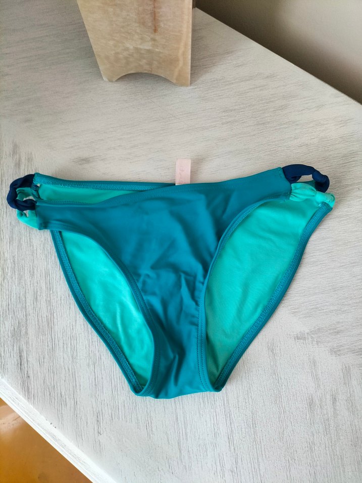Elastik bantlı ve askılı turkuaz renkli, renkli ve dikkat çekici kadın bikini altı. Plajda rahat ve şık kullanım sağlar.