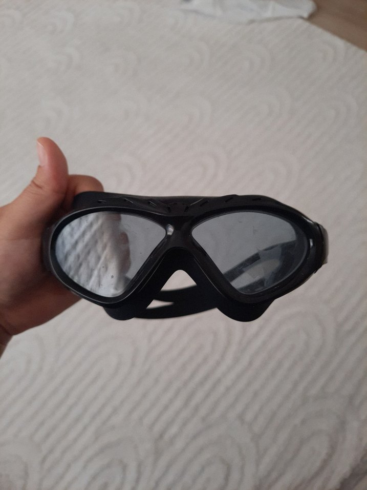 Şeffaf camlı, siyah minimalist yüzücü gözlüğü. Biker tarzına uygun, sıkı oturan tasarım. Plajda şık kullanım için ideal. ️
