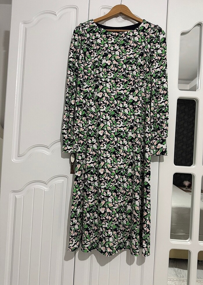 Hiç kullanılmadı pamuk viskon kumaş biraz kayık yaka bekden oturan A kesim kol agzı kendinden manşetli boydan astarlı Omuzdan boy 112 cm Kol boyu 62 cm Bel 38 cm Kol agzı 10 cm Yaka acıklık 23 cm