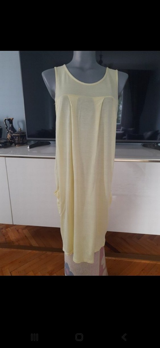 Açık sarı penye elbise/pareo. Salaş kesim ve drapeli detaylara sahip, yuvarlak yakalı, mayo üstüne kullanim için uygundur. iki kol arası 50cm,boyu 97cmdir.pile altında kalan ve asla görünmeyen bir dikişi vardır, son resimde belirttim.marka temsili.