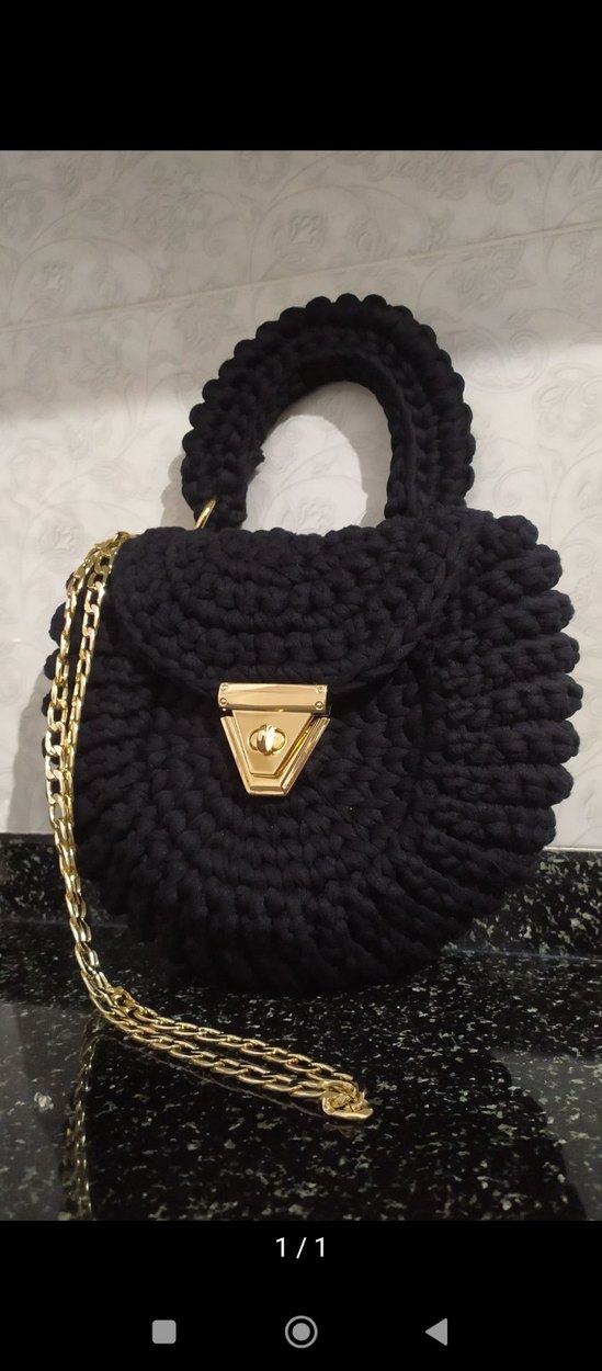 Siyah örgü kadın çantası, altın renkli kilit ve zincir askıyla gotik tarzı ve rahat örgü dokusunu bir araya getiriyor. istenilen renkte de yapılabilir