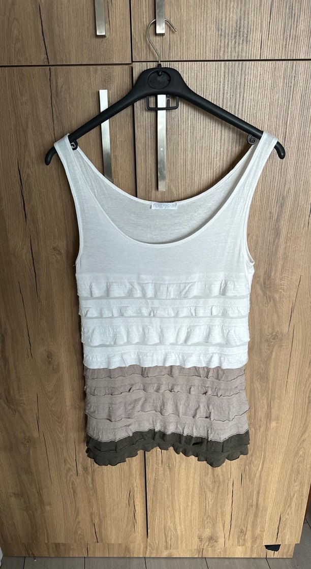Penye kumaştan, kolsuz ve yuvarlak yakalı, bol kesim elbise. Bej, gri ve zeytin tonlarında katmanlı fırfırlar içerir. Günlük kullanıma uygundur. 1 kere giyildi hatasız