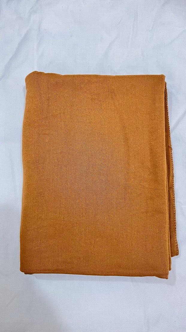 Bej keten kumaştan, drapeli kadın şal. Minimalist ve bohem tarzda, sade ve basic görünüm için uygun, hafif parlak dokunuşlu.