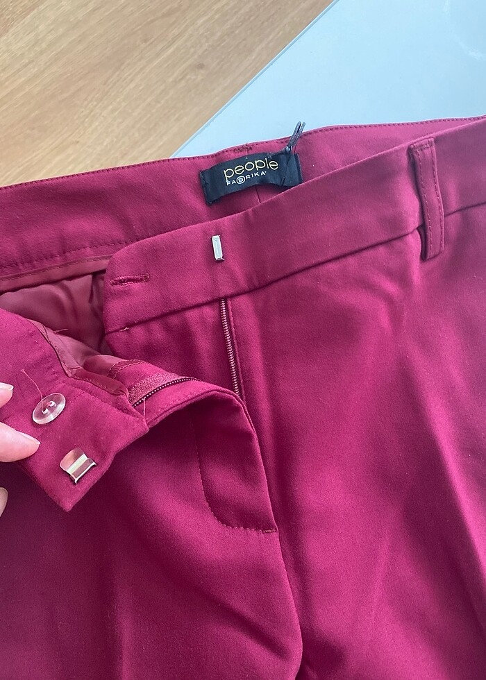 Rengi bordo değil mürdüm rengidir. Seçeneklerde mürdüm olmadığı için en yakın ton bordoyu seçtim. Cigarette pantolon. Kumaşı yok ve sağlam, kalıbı ise çok rahattır. Paça iç kısmında mini yırtmaç detayı çok şıktır. Kurumsal işimden ayrıldığım için satışa koydum, yoksa satacağım bir pantolon değildi, fırsat ürünüdür alan memnun kalacaktır