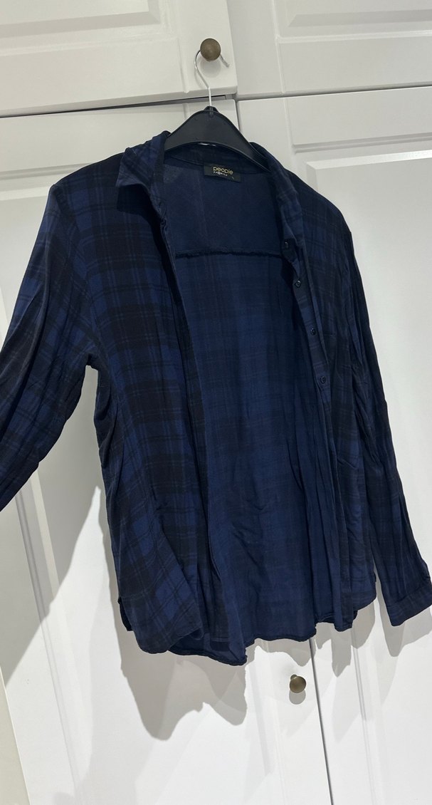 Lacivert kareli desen keten kumaştan, düğmeli önden, yakalı ve uzun kollu, bol kesim günlük kullanıma uygun gömlek. Hiç giymedim.